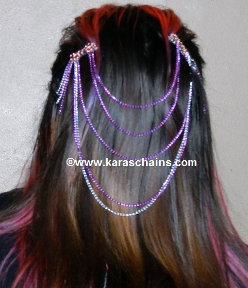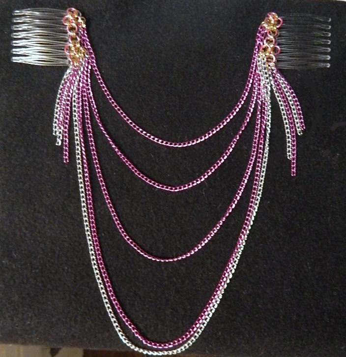 Pretty draping chains attached to comfortable plastic combs. Accented by chain dangles. A lovely piece that can be worn anywhere any time with your hair up or down!