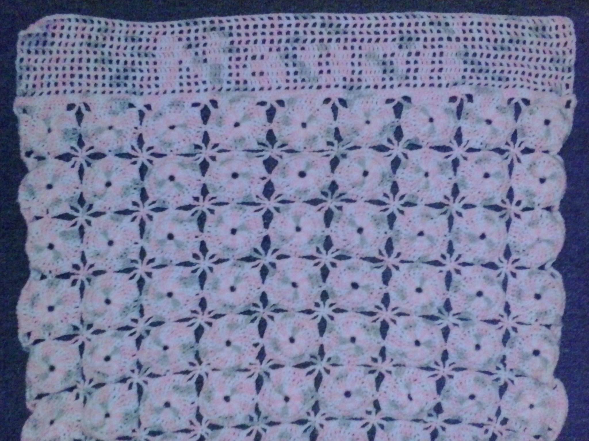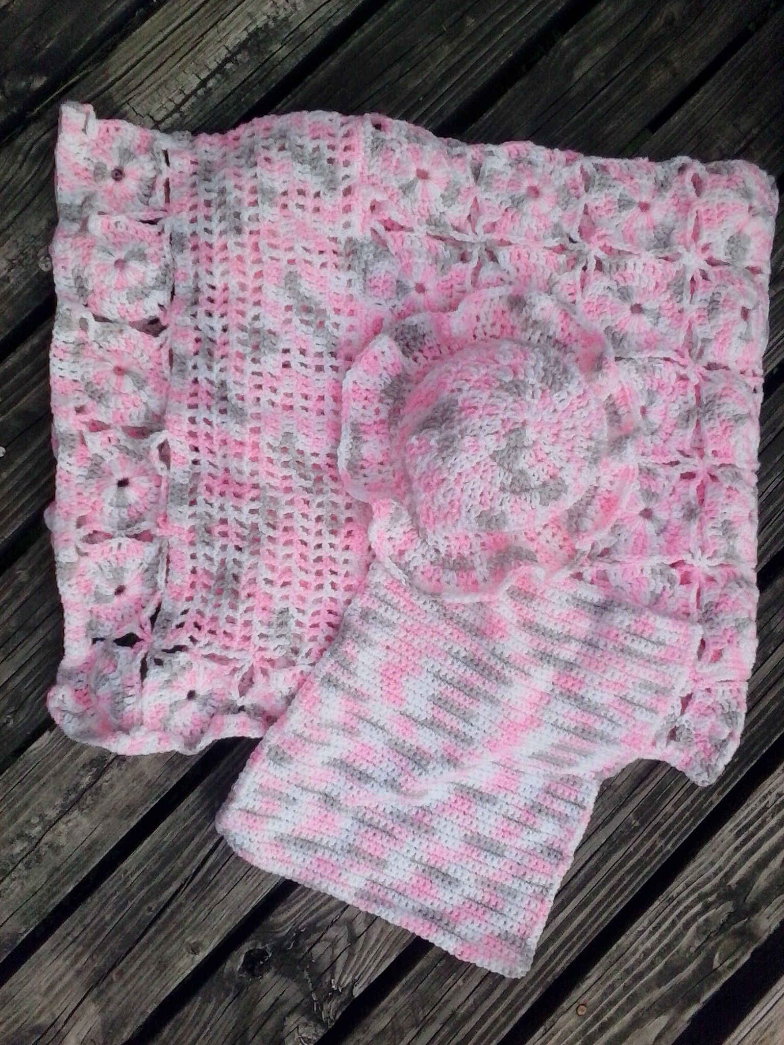 Personalize your baby gift. This pretty handmade baby blanket features a design that works for boys and girls and has the baby's name crocheted right in. Set also includes shoulder dribble pad and a fun sun hat.